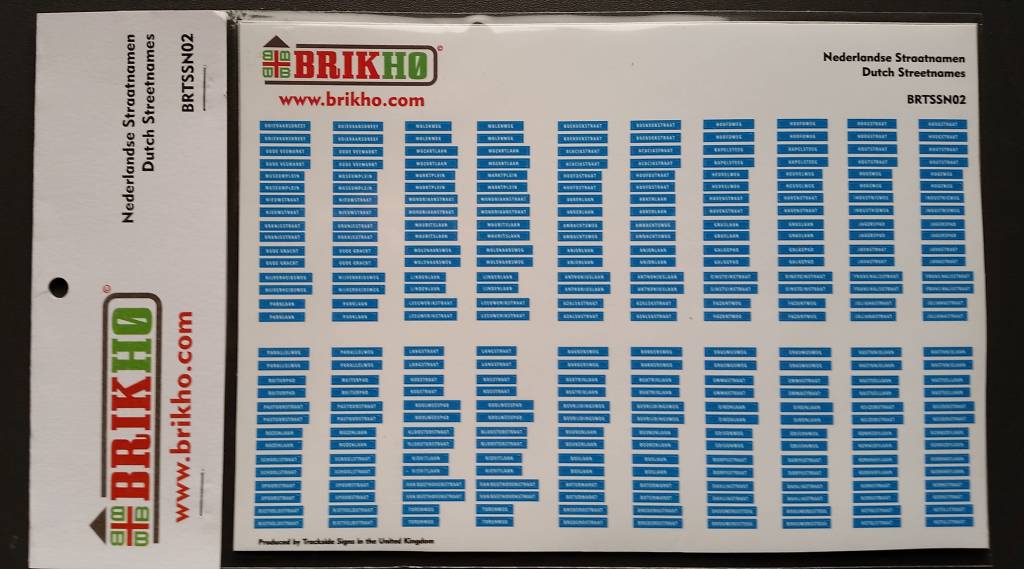 Dieses Produkt ist ein blatt mit 75 x 4 Niederländische Straßennamen in Spur H0. So können Sie auf jede Ecke von die Straße das gleiche Straßenschild aufkleben. Innerhalb die Serien van 75 gibt es die meist auftretende Straßennamen. Dieses Brikho Produkt ist gedruckt worden auf eine sehr hohen qualitäts Presse und auf ein self-adhesive Medien das mit State-of-the-art Präzision Werkzeuge Gelocht ist für das beste Resultat. Ab jetzt können sie mit dieses einzigartiges Product Ihre Modelbahn die finishing touch geben durch Ihre Modelbau Straßen durch zu führen mit die authentische Straßennamen von Brikho.