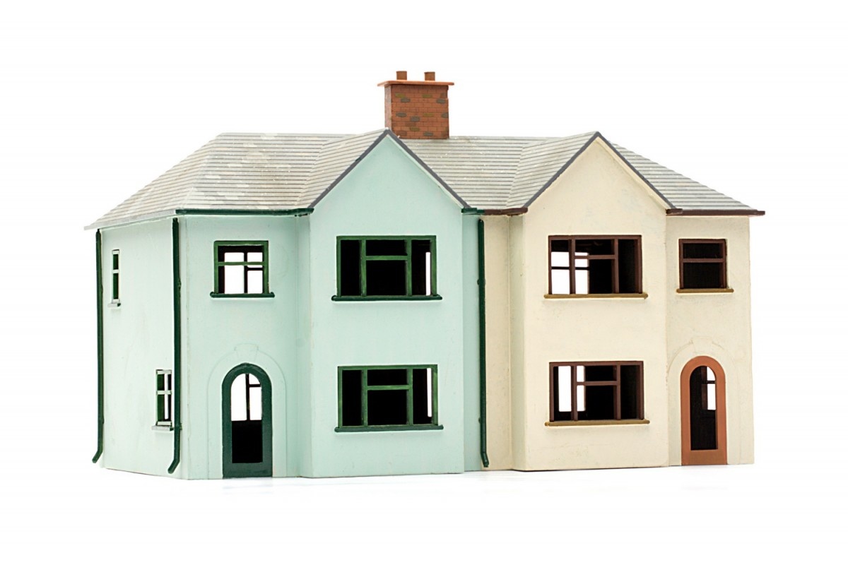 Plastikbausatz eines Doppelhauses. Für das beste Endresultat soll das modell bemalt werden (Farbe und Kleber nicht mitgeliefert).