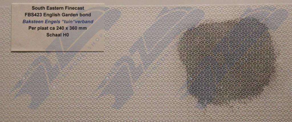 Styrenplatte mit einem Backstein Englisches "garten" Verbund motiv in Weiße Farbe. Die Platte ist etwa 26 x 36 cm groß (Effektiv brauchbar minimal 24x34cm) und ist sehr flexibel. Hiermit stellen Sie Gebäuden nach eigenem Entwurf her. Dies betrifft Artikelnummer FBS423 von South Eastern Finecast