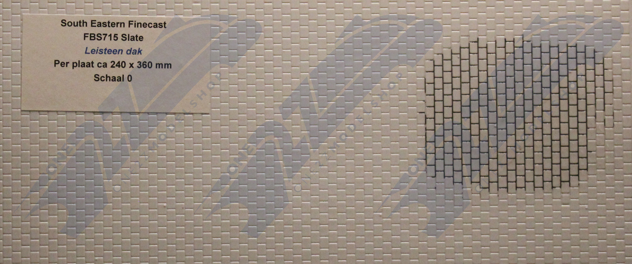 Styrenplatte mit einem Schiefer motiv in Weiße Farbe. Die Platte ist etwa 26 x 36 cm groß (Effektiv brauchbar minimal 24x34cm) und ist sehr flexibel. Hiermit stellen Sie Gebäuden nach eigenem Entwurf her. Dies betrifft Artikelnummer FBS715 von South Eastern Finecast