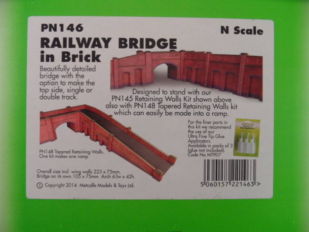 Dies ist ein Bausatz aus Karton in Baugröße N von eine Eisenbahnbrücke ausgeführt in rotem Backstein. Diese Eisenbahnbrücke läßt sich ideal kombinieren mit Arkadenstützmauer PN145 und Arkadenstützmauer, steigend PN148