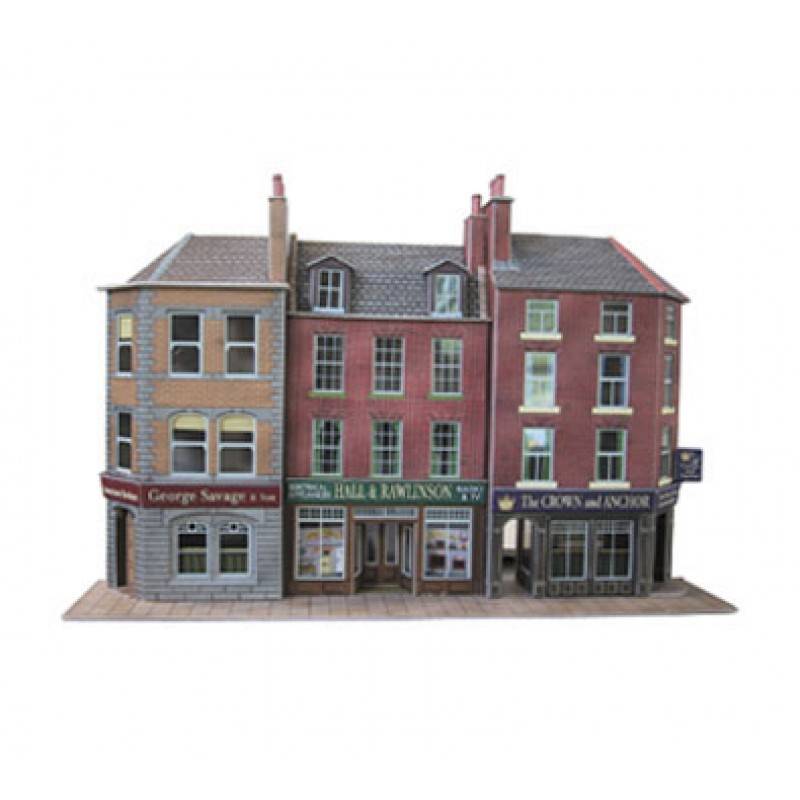 Dies ist ein Karton-Bausatz in Baugröße H0/OO. Es enthält Vorderseiten von städlichen Wohnhäusern mit im Erdgeschoß zwei Läden und eine Kneipe. Der Bausatz ist nur geeignet als Hintergrundmodell