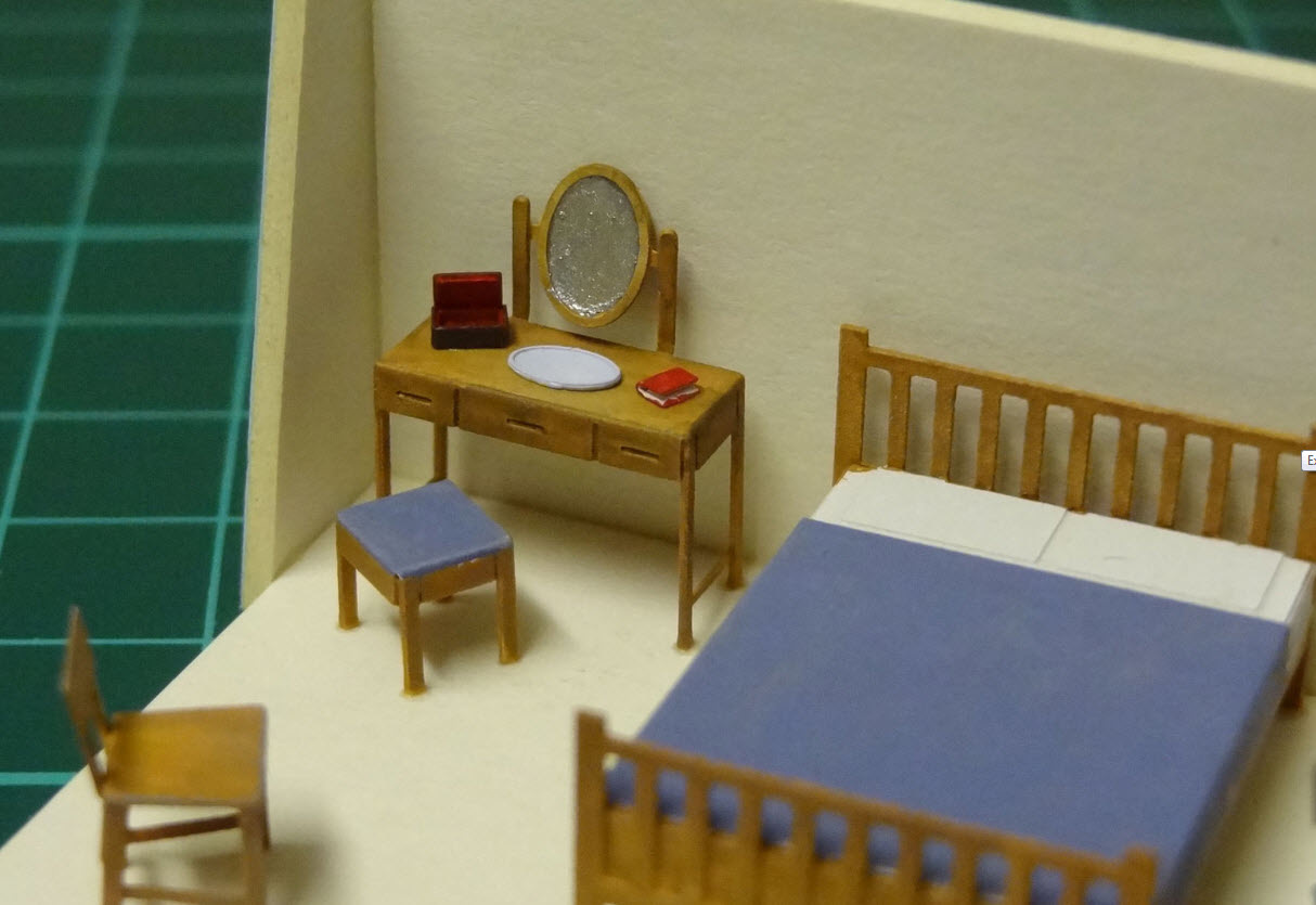 Enthält Betten, Stühle, einen Tisch, einen Kleiderschrank, einen Schreibtisch, einen Schminktisch und einen Hocker sowie noch feinere Details mit Tellern, Büchern, Akten und einer Schmucks