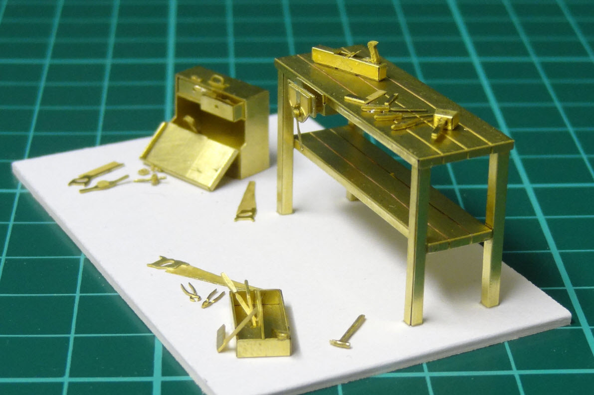Enthält Werkbank, Schraubstock, Werkzeugkasten, Werkzeugablage und zahlreiche Werkzeuge.