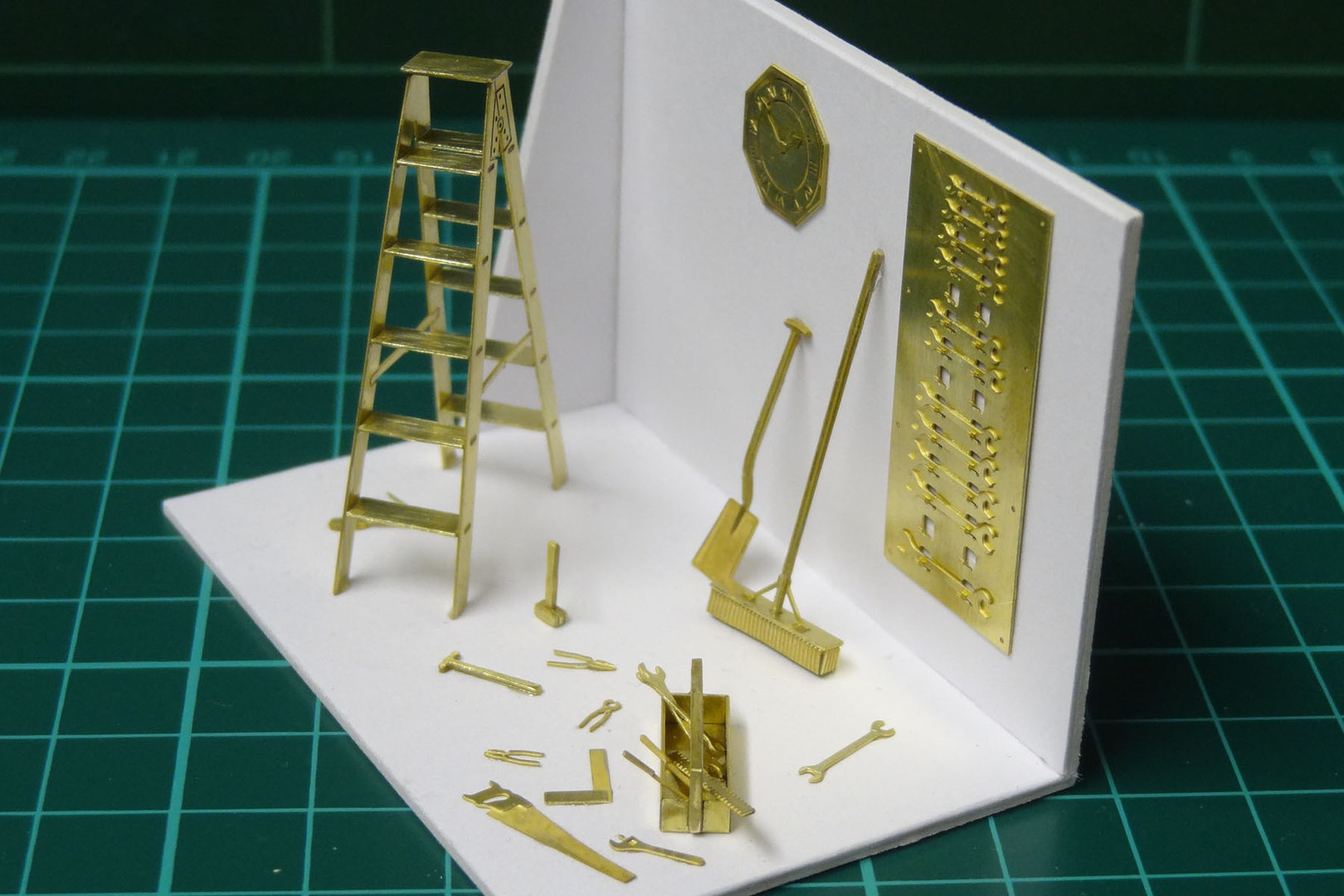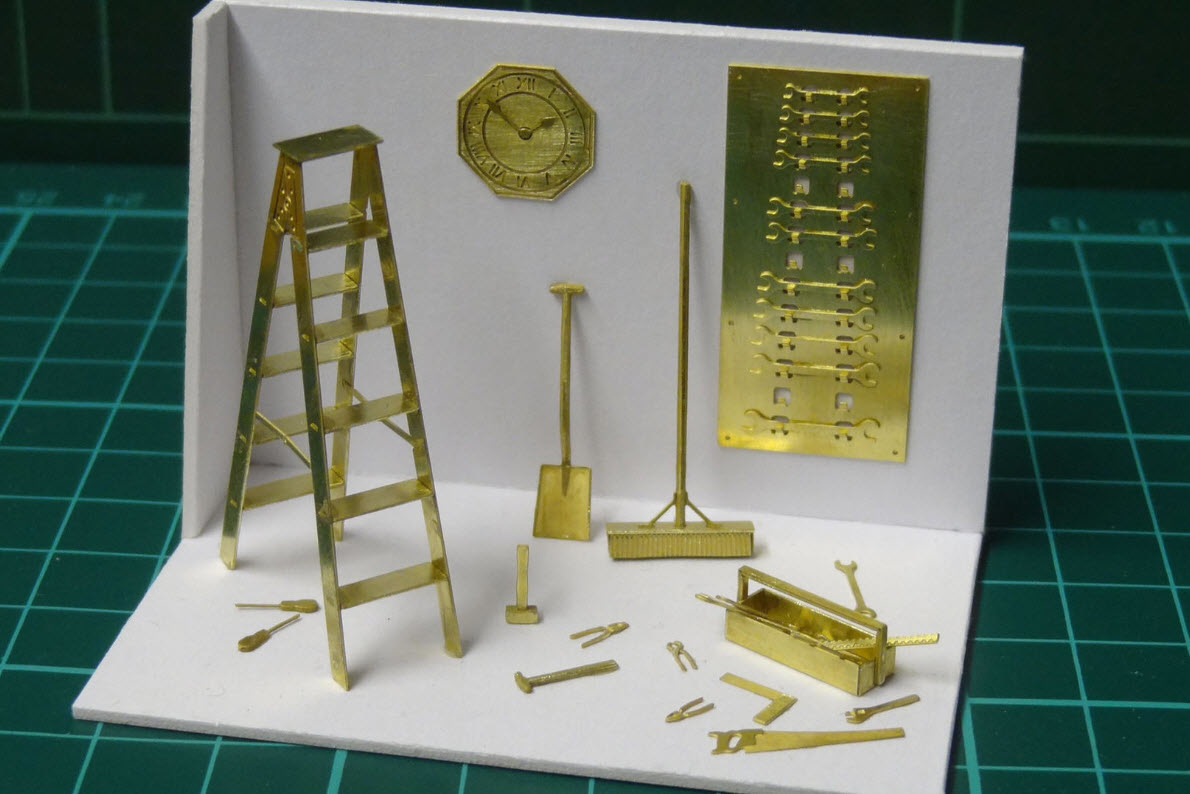 Beinhaltet eine Trittleiter, einen Schraubenschlüsselhalter, einen Werkzeugkasten, einen Besen, eine Uhr und viele Werkzeuge.