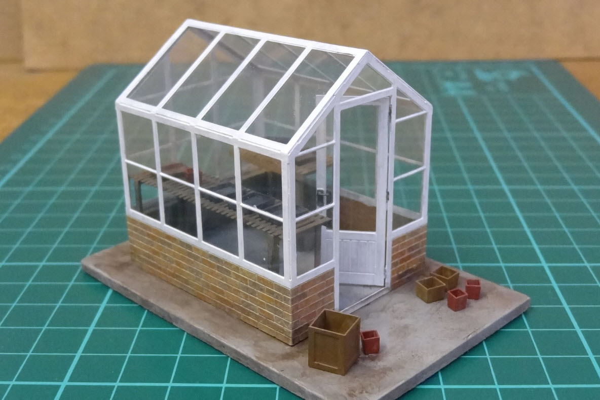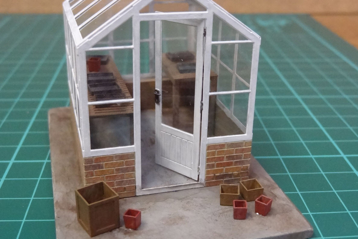 Enthält ein Gewächshaus, Topftische, Pflanzentöpfe und Saatgefäße.