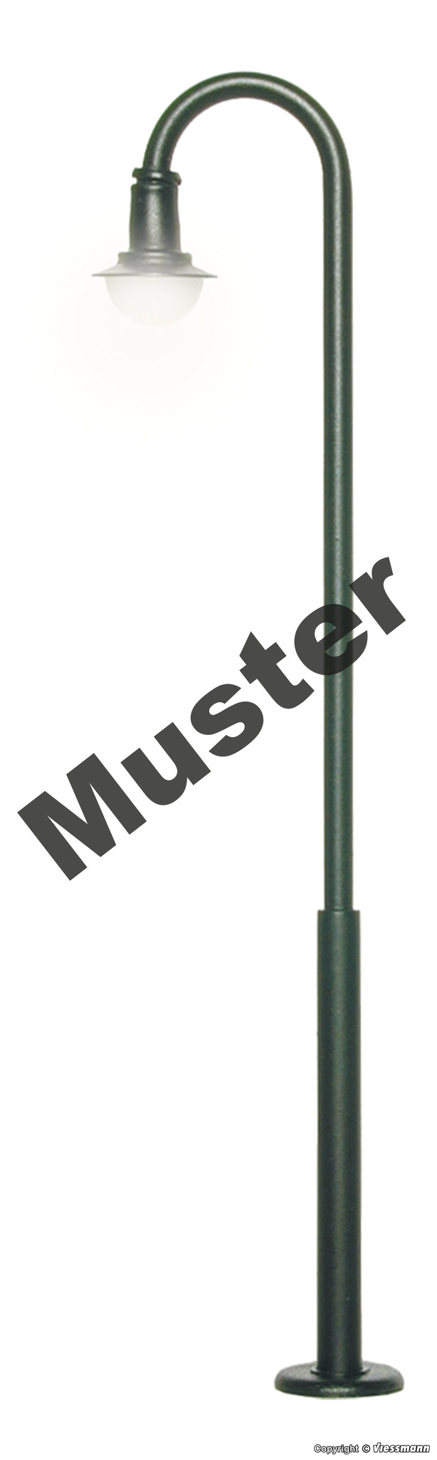 Komplettbausatz. Wartungsfrei dank LED-Beleuchtung. Vorbildgetreuer Messingmast mit Patentsteckfuß für eine besonders einfache Montage. Zusammenbau ohne Löten und Werkzeug. Bogenleuchte im Stil der Epochen III Höhe: 8,7 cm.