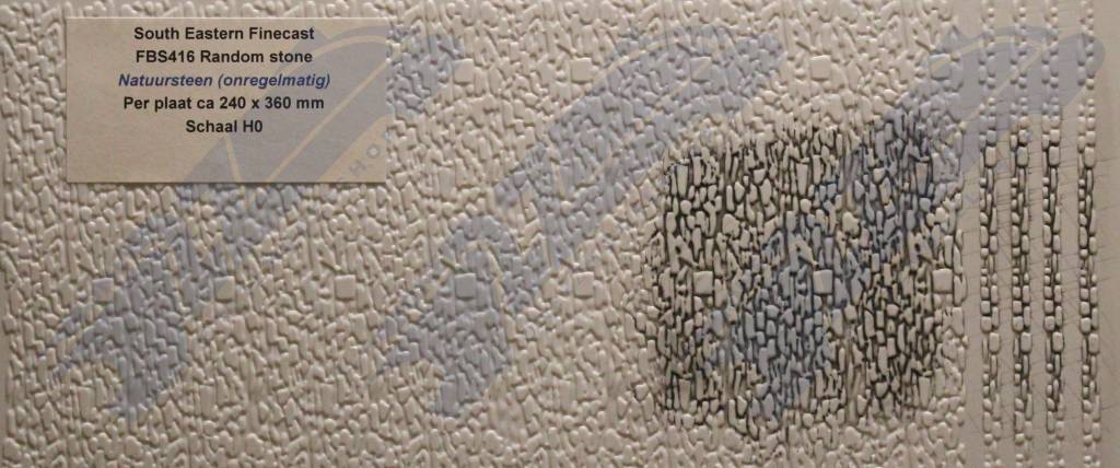 Styrene sheet embossed with Random stone motive in H0/OO gauge. These very flexible sheets measure app. 26 x 36 cm (Effectively usable minimal 24 x 34 cm) and are supplied in a white colour. This is type FBS416 from the South Estaren Finecast range.