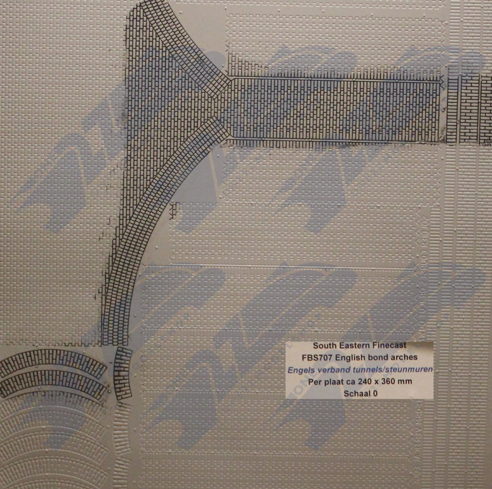 Styrene sheet embossed with English bond arches motive in O gauge. These very flexible sheets measure app. 26 x 36 cm (Effectively usable minimal 24 x 34 cm) and are supplied in a white colour. This is type FBS707 from the South Estaren Finecast range.