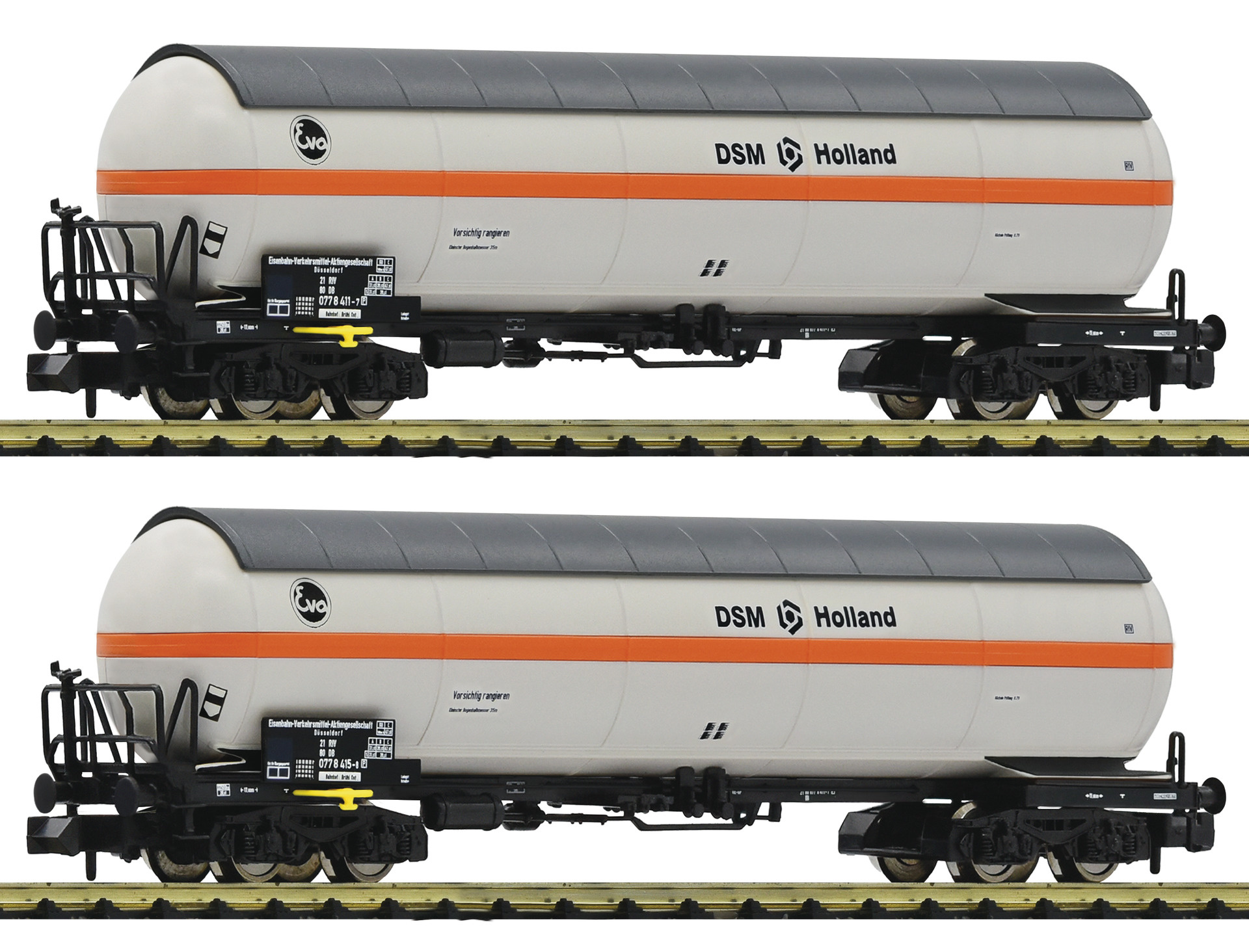 The set contains two pressure gas tank wagons, type Zags, "Eva/DSM" that operates for the Dutch State Railways.