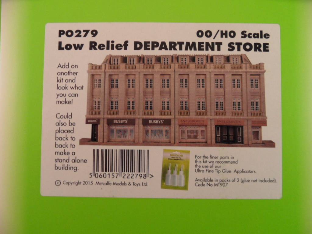 Cardboard kit of a department stor in low relief. Due to the modular construction of the kit it is very easily possible to combine more kits into one bigger building. This kit can also be combined very beautifully with the other low relief kits PO205...