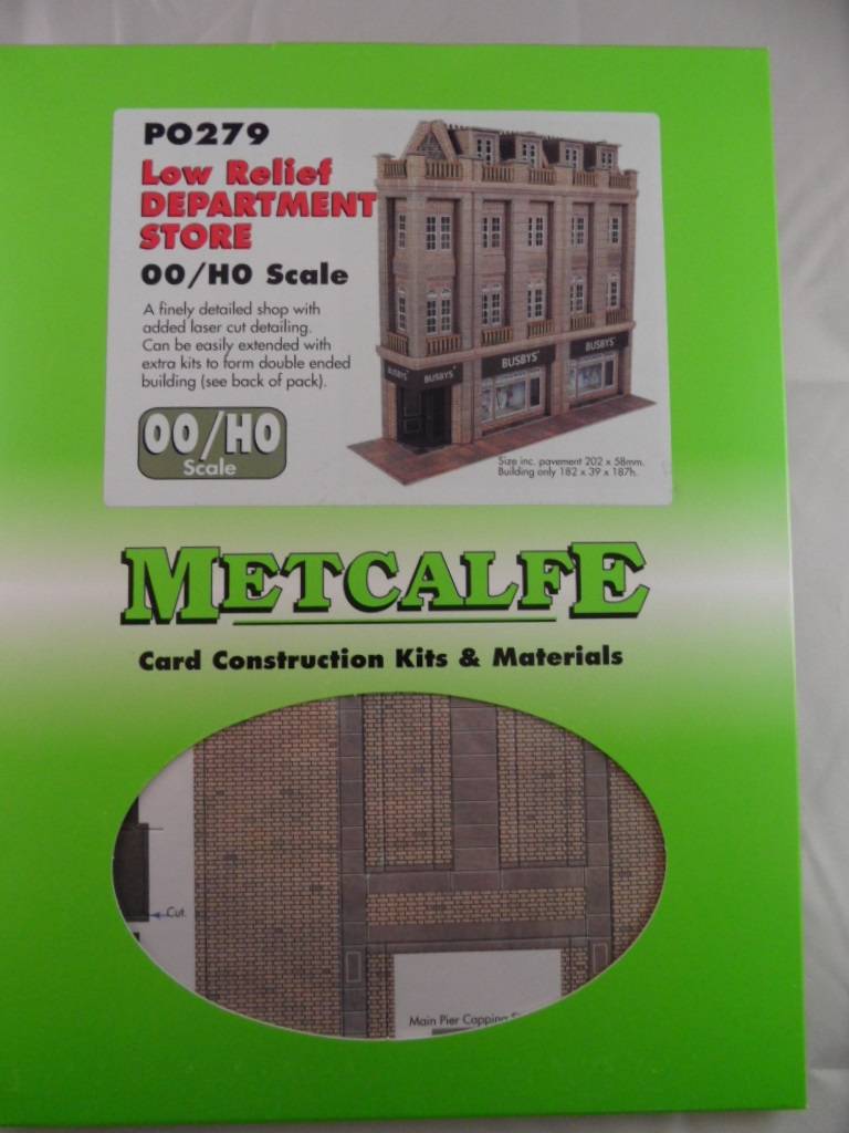 Cardboard kit of a department stor in low relief. Due to the modular construction of the kit it is very easily possible to combine more kits into one bigger building. This kit can also be combined very beautifully with the other low relief kits PO205 (pub and shops, PO206 (cinema) and PO271 (bank and shop)