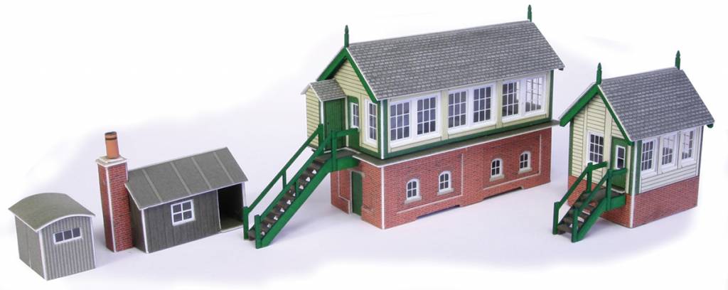 Cardboard scale modelkit in N gauge of a large and a small signal box, based on an LNWR design. Also included are a lineside building and lamp hut.