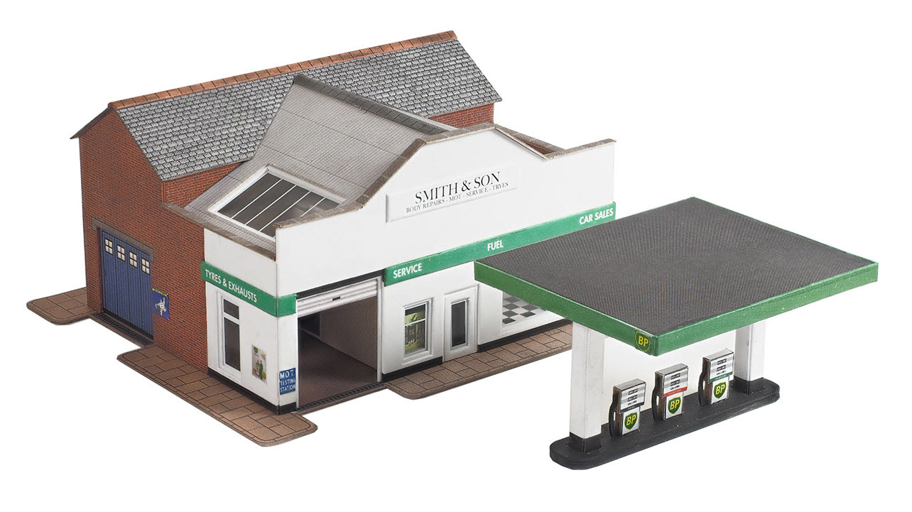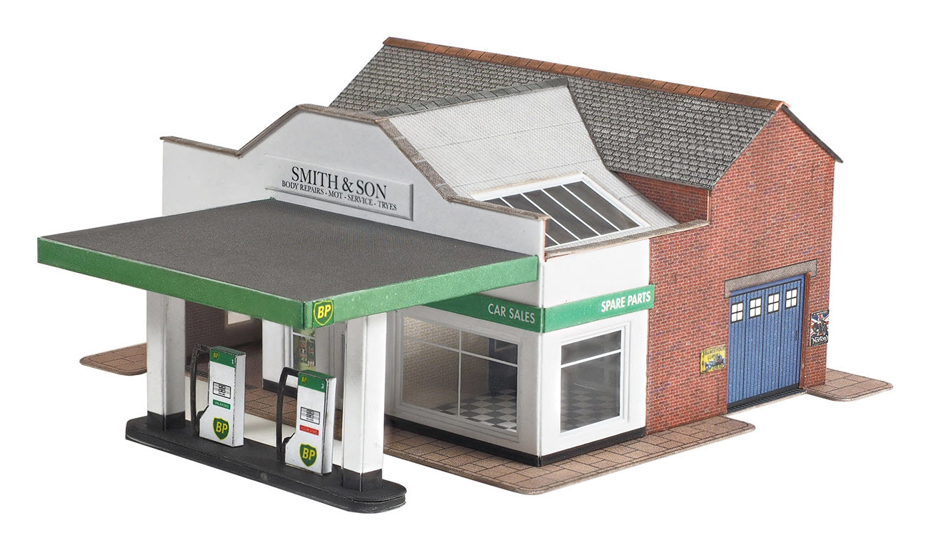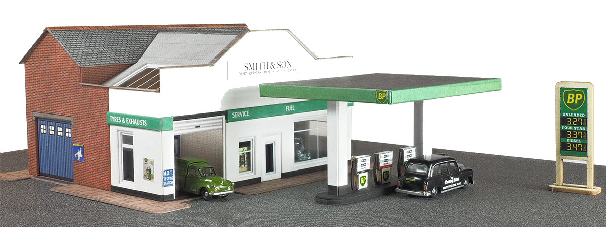 Cardboard scale modelkit in N gauge of a small garage facility with showroom, service bays, petrol pumps and canopy. Comes with a selection of different signs and two different laser cut petrol pump styles.