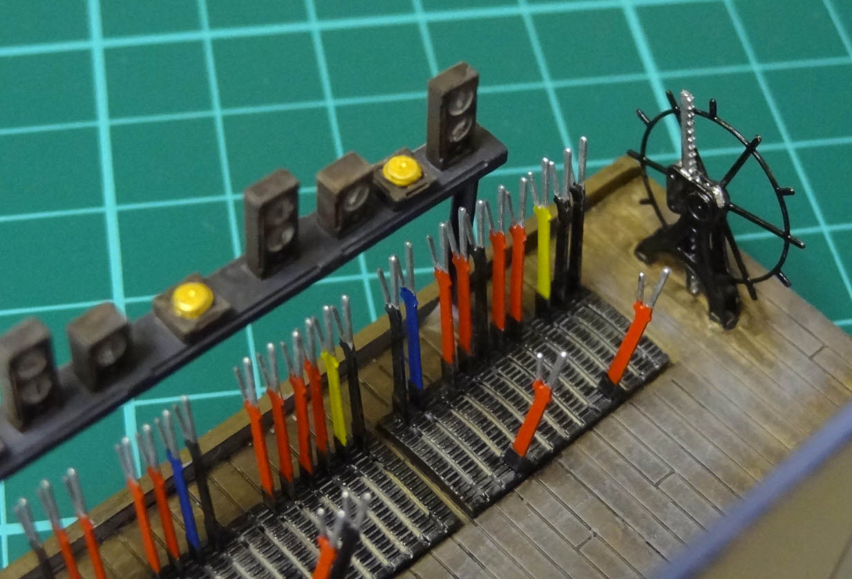 Contains 36 levers in three frames of 12 each, as well as block instruments, bells, level crossing wheel, an armchair, wall clock, cabinet, stove with chimney pipe, and a coal shovel.