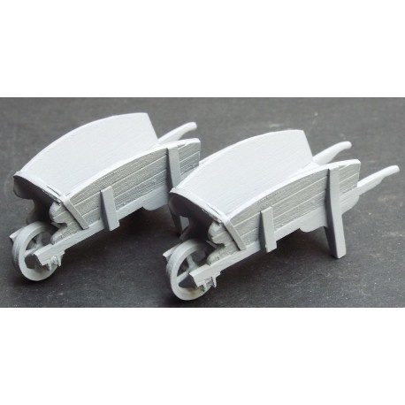 Resin/White metal 2 Wooden wheel barrows, gauge O. In order to achieve the best result, this model can be painted. paint and glue NOT included.