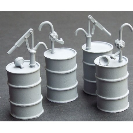 Resin/White metal Oildrums with pumps, gauge O. In order to achieve the best result, this model can be painted. paint and glue NOT included.