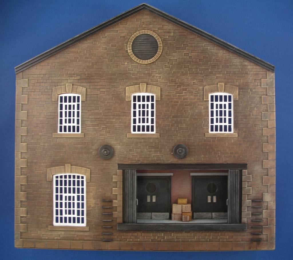 Resin two storey gable ended warehouse/factory + loading bay WxH 28x26cm, gauge O.