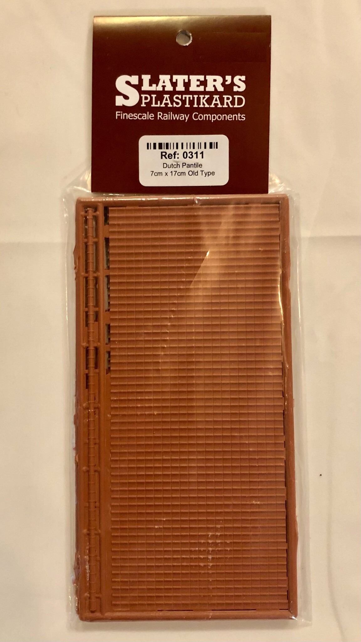 2 pieces of builders sheets in dutch pantile motive. Each sheet is app. 17 x 7.5 cm and also includes a ridge. . This is Nr. 311 from the Slaters Plastikard range