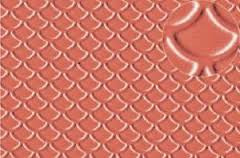 Styrene sheet embossed with roofing tile scalloped shell motive in H0/OO gauge. These very flexible sheets measure app. 19 x 30 cm and are supplied in a stone red colour. These are type 0438 of the Slaters Plasticard range.
