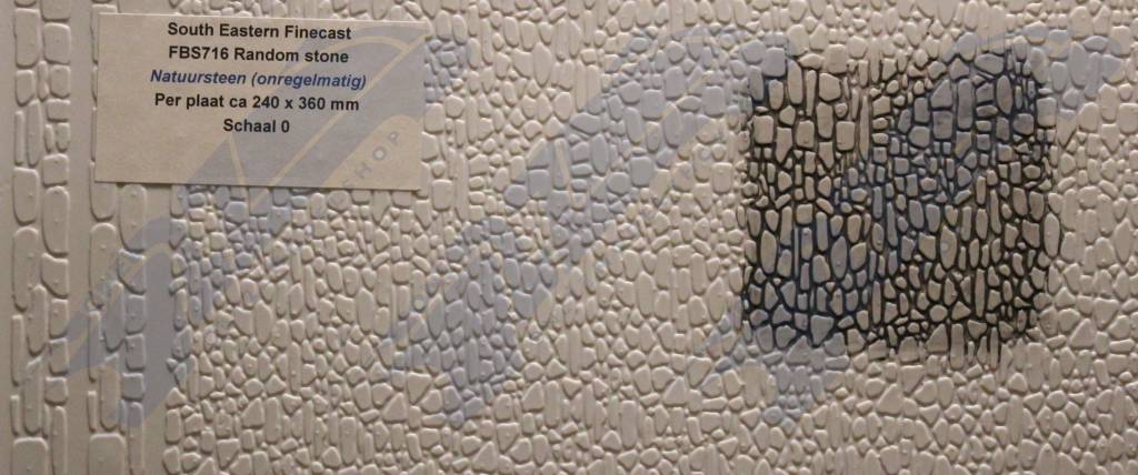 Styreen plaat met een motief van natuursteen (onregelmatig) in witte kleur. De plaat meet ca. 26 x 36 cm (bruikbare oppervlakte minimaal 24x34 cm) en is erg flexibel. Hiermee creëert u gebouwen naar eigen ontwerp. Dit betreft typenummer FBS716 van South Eastern Finecast.