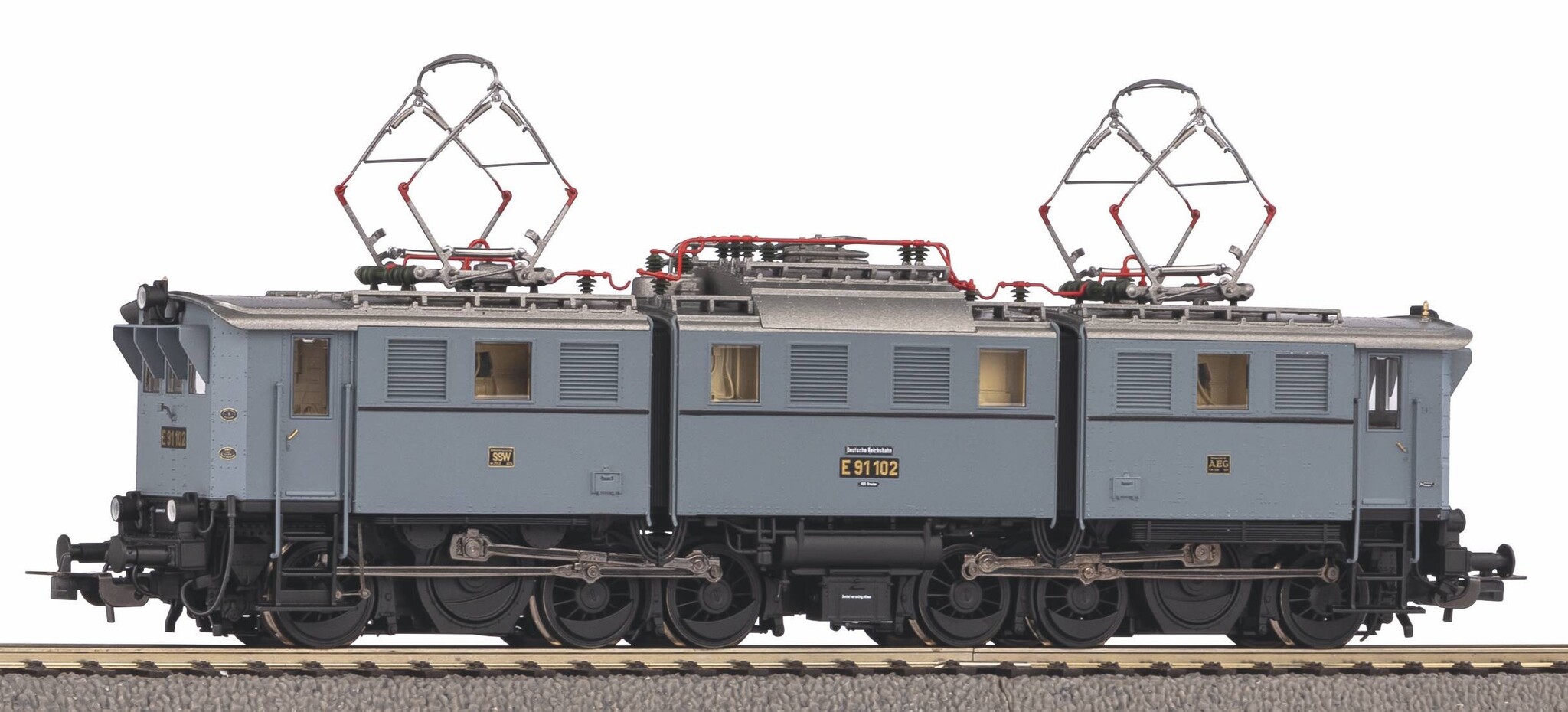 Neuheit 2022: Variante der BR 191 als BR E 91 der DRG in Epoche II. Elektroloks mit Stangenantrieben zählen zu den Glanzlichtern auf der Modellbahnanlage. Das oft archaische Äußere und die sichtbare Kraftübertragung strahlen die Faszination vergangener Eisenbahnepochen aus. Diese hat PIKO perfekt eingefangen und in den Maßstab 1:87 transferiert. Die konstruktive Symbiose aus hervorragender Modellumsetzung und ausgezeichneten Fahreigenschaften zeichnen den Charakter der neuentwickelten PIKO E 91. Die scharfen Gravuren des Gehäuses, gepaart mit einer hochfeinen Bedruckung und garniert mit äußerst filigranen Stromabnehmern machen die Lok zu einem Schmuckstück. Kraft schöpft sie aus einem fünfpoligen PIKO Motor, zwei fein gewuchtete Schwungmassen sorgen auch bei schwieriger Gleislage für kontinuierliche Fahrt. Selbstverständlich verfügt das Modell über einen Lichtwechsel in LED-Technik mit roter Schlussbeleuchtung. Zusätzliche Beleuchtungsfunktionen können durch den in der Soundversion bereits integrierten PluX22-SoundDecoder geschaltet werden.
